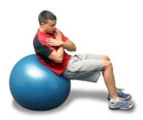 • Draw your abdominals in and slowly crunch while rotating your upper body to a position in which you can maintain neutral hip alignment.  Keep your chin tucked in to prevent a forward-head posture.  Hold the top position 2 seconds, then slowly return to the starting position, rounding your back over the ball while maintaining the drawing-in maneuver.  Repeat to the opposite side.
