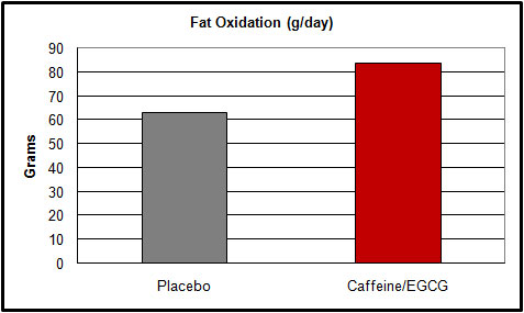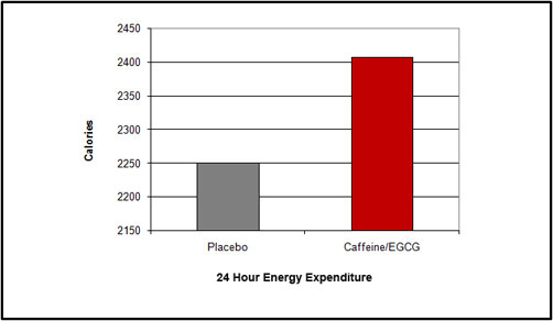 FIGURE 2: Studies demonstrate at least a 10% increase in 24 hour EE or equivalent to 157 more calories burned in the caffeine/EGCG group (Average test subject’s weight 173 lbs).