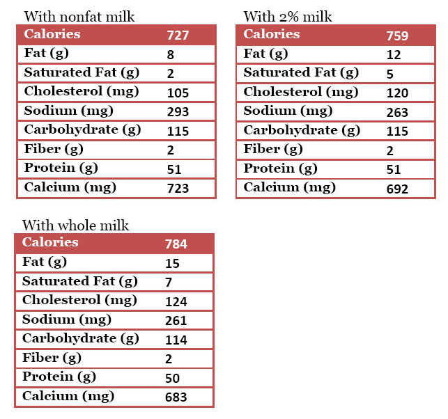 • 1 cup nonfat, 2% or whole milk (or milk substitute of your choice)