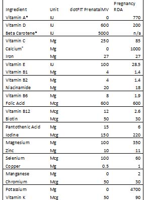 * Beta carotene is converted to vitamin A in the body as needed. Large doses of vitamin A during pregnancy have negative effects, whereas beta carotene does not. dotFIT has chosen to use beta carotene for the vitamin A source in the prenatal.