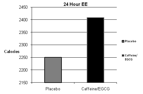 Studies show almost a 10% increase in 24 hour EE or equivalent to 157 more calories burned in the caffeine/EGCG group (Average subject’s weight 173 lbs).